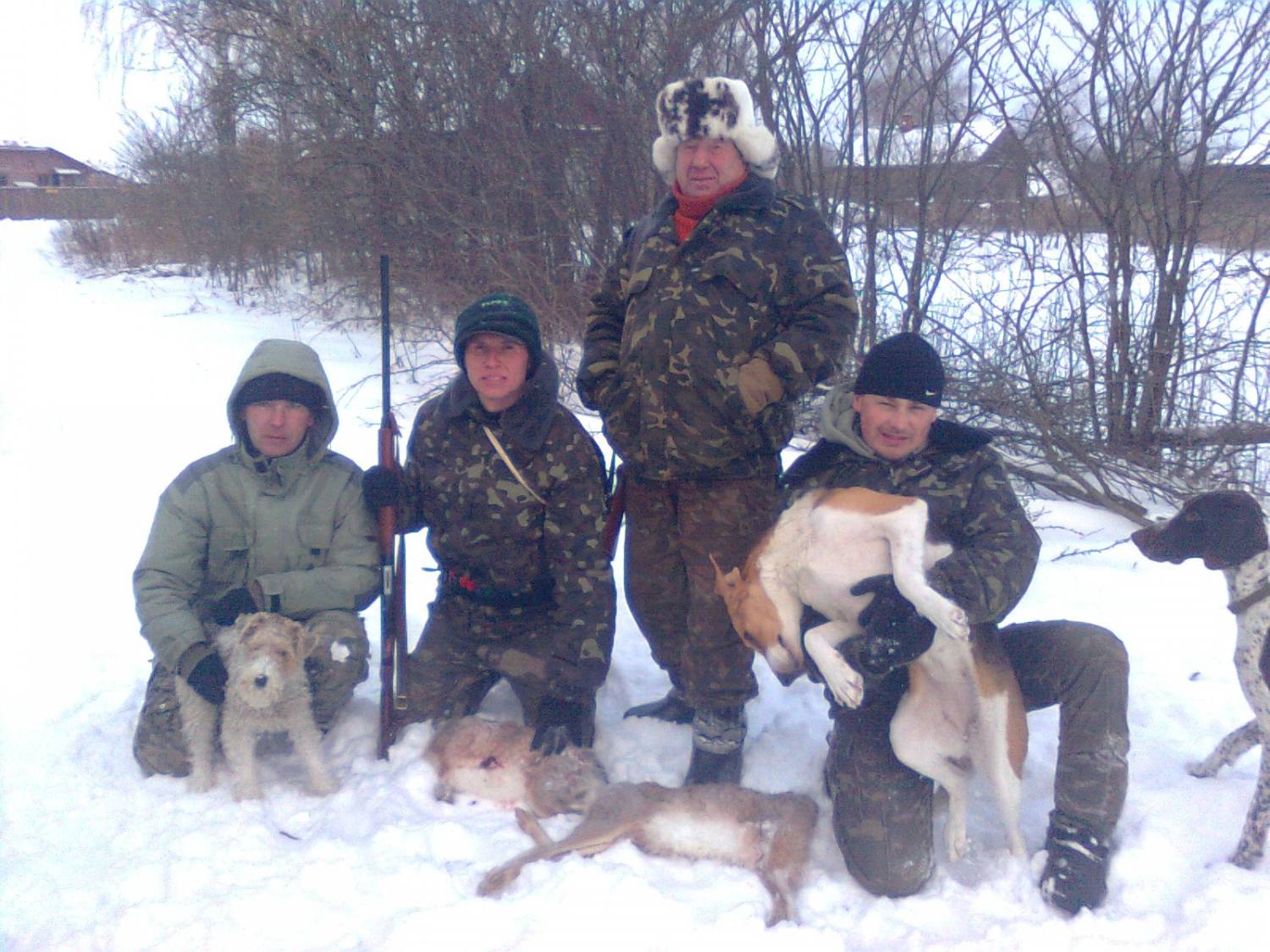 | Вчера ходили на охоту. В лесу были где то к восьми. Тишина, идет снег(и ночь шёл) . Свежих следов нет. Часа два хождений ни какого результата не дали - всё крепко лежит. Потом всё таки подняли зайца, гон хреновенький. И тут слышиться ещё один собака Но охотников в лесу кроме нас никого нету. В общем товарищ стреляет зайца из под того выжлеца - первый есть. Спустя минут тридцать хренового гона и из под нашей выжловки добыт первый заяц. Около двенадцати решаю идти домой, так как температурит - забалел . Потом выжловка подняла ещё одного зайца - полтора часа гона и заяц взят . Выжлец пошёл со мной домой , так что ищеться хозяин . У собаки ошейник в виде цепочки с колокольчиком. Выжлец не крупный, я бы сказал мелкий. Мой тел 0937649952